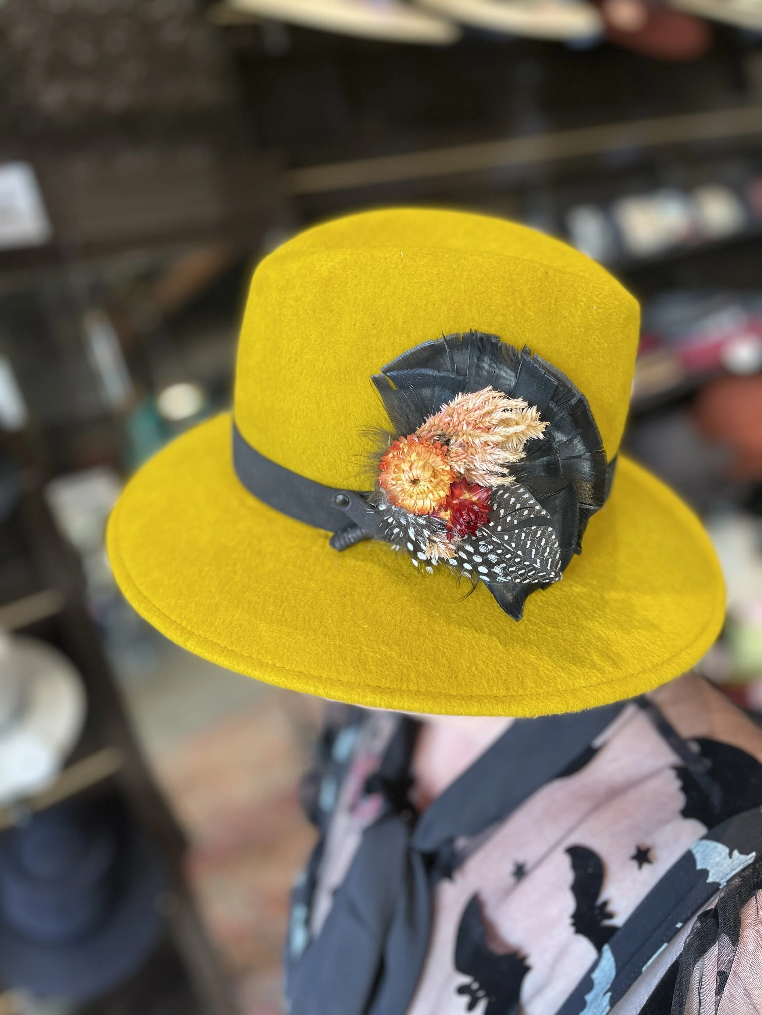 We have a beautiful feather bar stocked with single feathers, dried flowers, and pre-made feather arrangements to trim your hat.