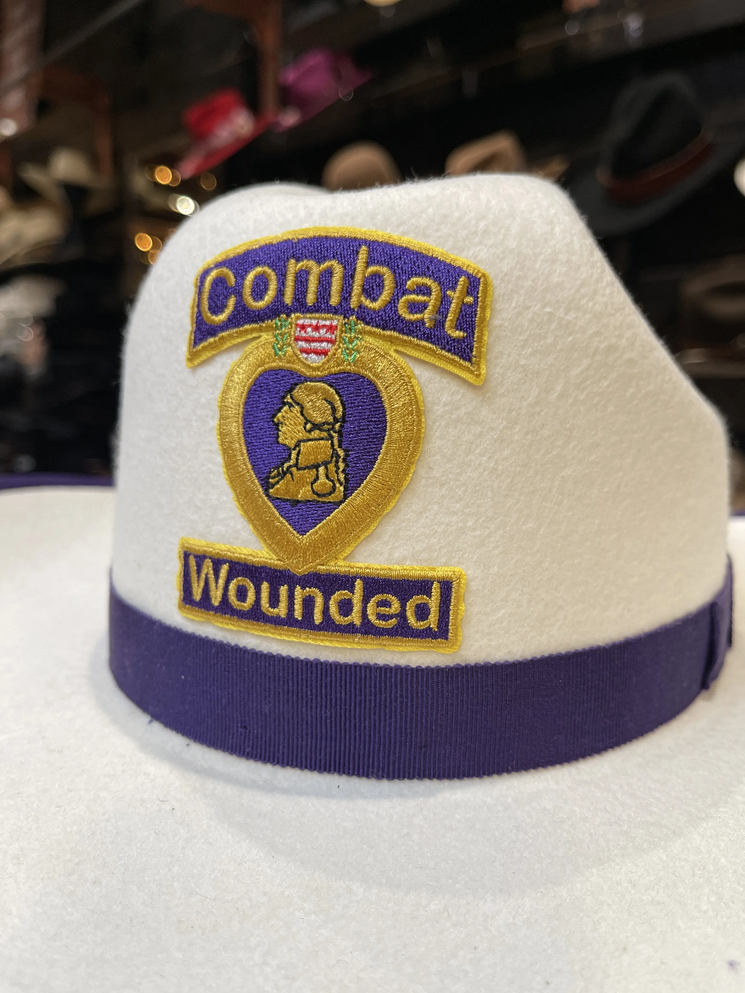 Robert wanted us to make him a white cowboy hat with purple binding that would match the colors of his Purple Heart Patch we sewed to the front of the hat.